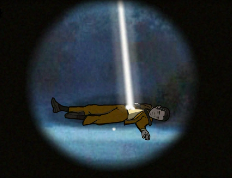 Dale is seen through the TV screen on the Mill's top floor, placing the black and white cubes into the TV before he disappears in a flash of light. Outside of the Mill's window there is a beam of light shining down by the Chapel, which falls down on Dale. Mr. Owl steps towards him, and mysteriously causes him to rise as he brings a storm needed to power the Memory Extractor inside the Mill.